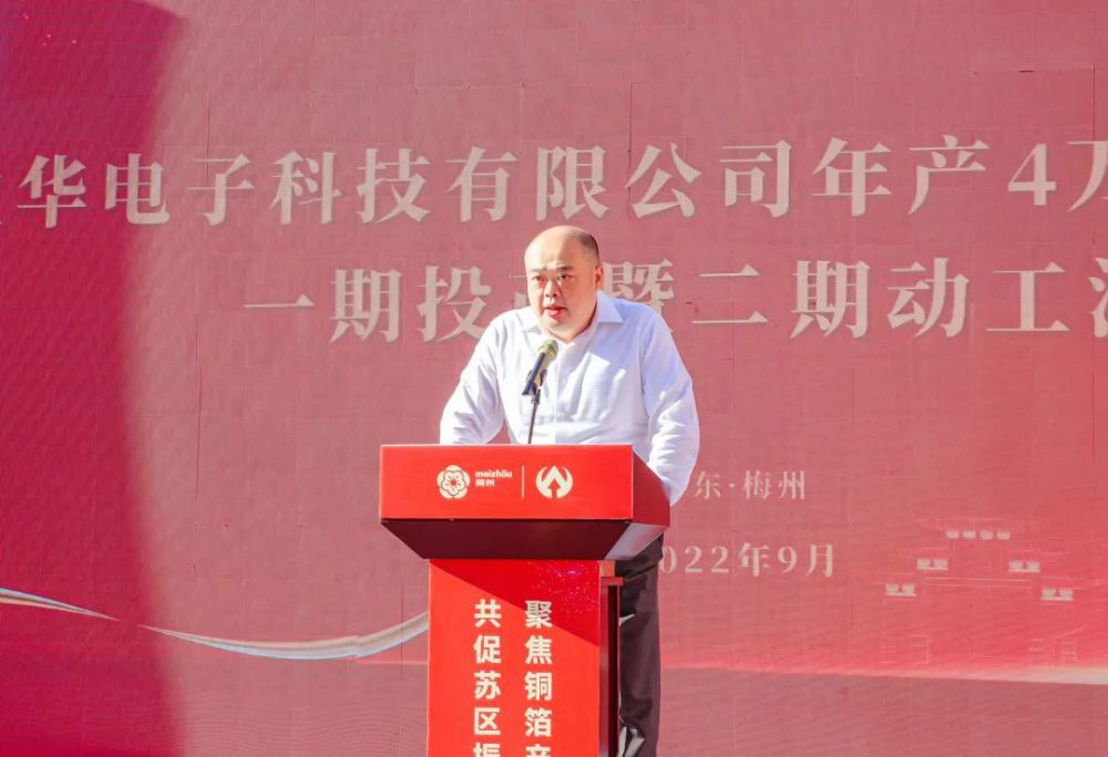 梅州市委常委、副市長、梅江區委書記陳金鑾代表市委市政府致辭,向廣東盈華電子科技有限公司高端銅箔項目一期投產暨二期動工表示熱烈的祝賀。他表示,盈華高端銅箔項目是我市重點“打糧食”項目之一,自項目啟動以來,拿地即動工,一年即投產,跑出了重點項目落地的加速度,這是貫徹落實習近平總書記“疫情要防住,經濟要穩住,發展要安全”重要指示要求的生動實踐。項目的投產將進一步壯大梅江信息產業集群,助力梅州加快打造“中國銅箔之都”。他強調,市直有關部門要用心用情優服務,突出抓好項目審批全面提速、惠企政策精準落地、營商環境持續優化;深化“暖企”行動,為企業發展和項目建設“鋪路架橋”,用政府的誠信贏取企業家的信心、用干部的“辛苦指數”換取企業的“發展指數”。希望盈華科技堅定發展信心,爭取早日實現一期滿產滿銷及加快二期建成投產,為推動梅州蘇區加快振興、共同富裕貢獻力量。