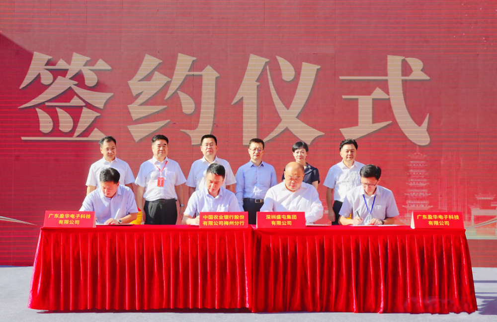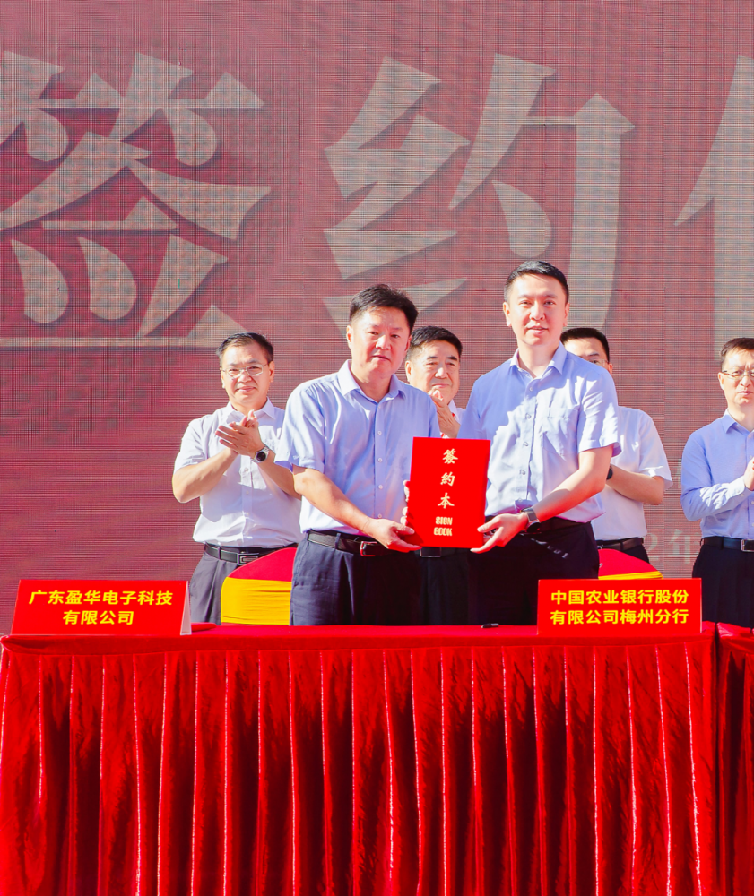 廣東盈華電子科技有限公司董事長李劍明與中國農業銀行股份有限公司梅州分行行長陳濤簽訂《全方位合作協議》。