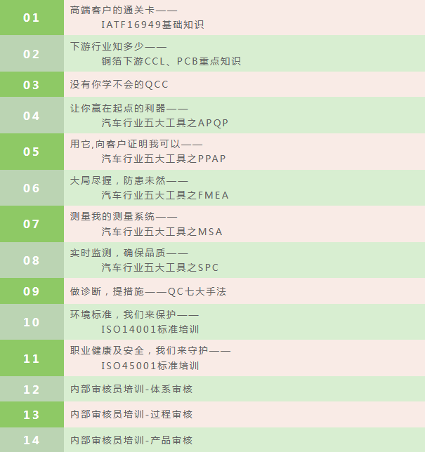 為實現“創新助力工業強國夢想,匠心鑄造銅箔中國品牌”的遠大抱負,建立健全人才發展及企業文化體系,全面提升員工專業及綜合能力,更好地為客戶提供優質的產品和服務,我司會在未來開展不同主題系列的培訓活動。