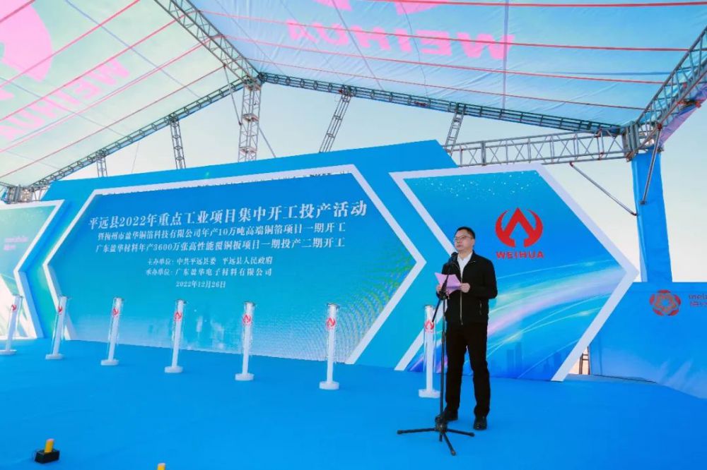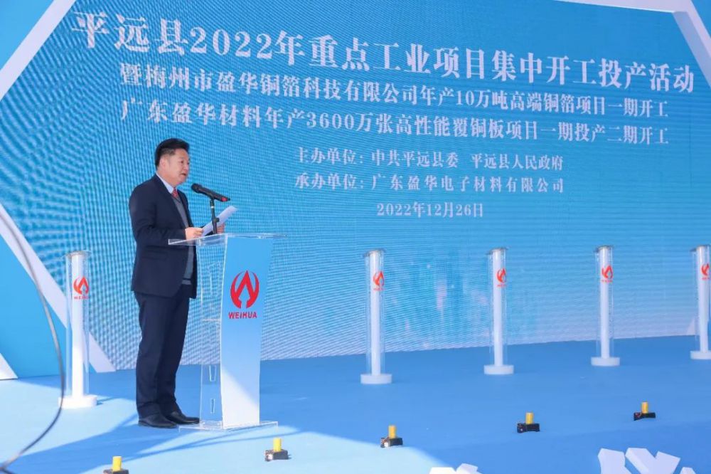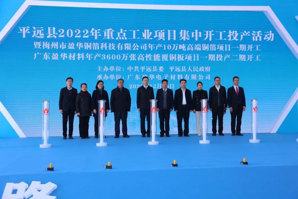 2022年12月26日上午,梅州市平遠縣2022年重點工業(yè)項目集中開工投產活動暨梅州市盈華銅箔科技有限公司年產10萬噸高端銅箔項目一期開工、廣東盈華材料年產3600萬張高性能覆銅板項目一期投產二期開工活動在梅州平遠高新技術產業(yè)開發(fā)區(qū)隆重舉行!
