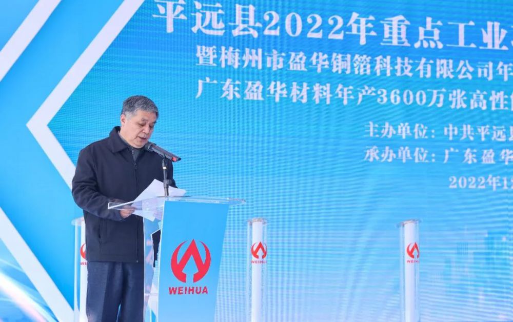 梅州市委副書記、市長王暉代表市委市政府致辭,向盈華銅箔科技年產10萬噸高端銅箔項目一期開工表示熱烈的祝賀。他表示,盈華銅箔科技年產10萬噸高端銅箔項目一期順利開工體現(xiàn)了市、縣各級各部門樹立“產業(yè)興市、制造強市”的鮮明向導,也彰顯了威華集團作為本土鄉(xiāng)賢企業(yè)的情懷和擔當。他要求各級政府部門要為制造業(yè)擔當,不斷增強梅州蘇區(qū)振興發(fā)展的內生動力,積極打造懂企業(yè)的政府,主動對接項目和企業(yè),積極協(xié)調解決項目過程中遇到的難點堵點,推動項目早日建設、早投產、早達效。并勉勵企業(yè)堅定發(fā)展信心,集中骨干力量,高標準、高質量、高效率完成項目建設,助力梅州打造千億級先進材料產業(yè)集群。