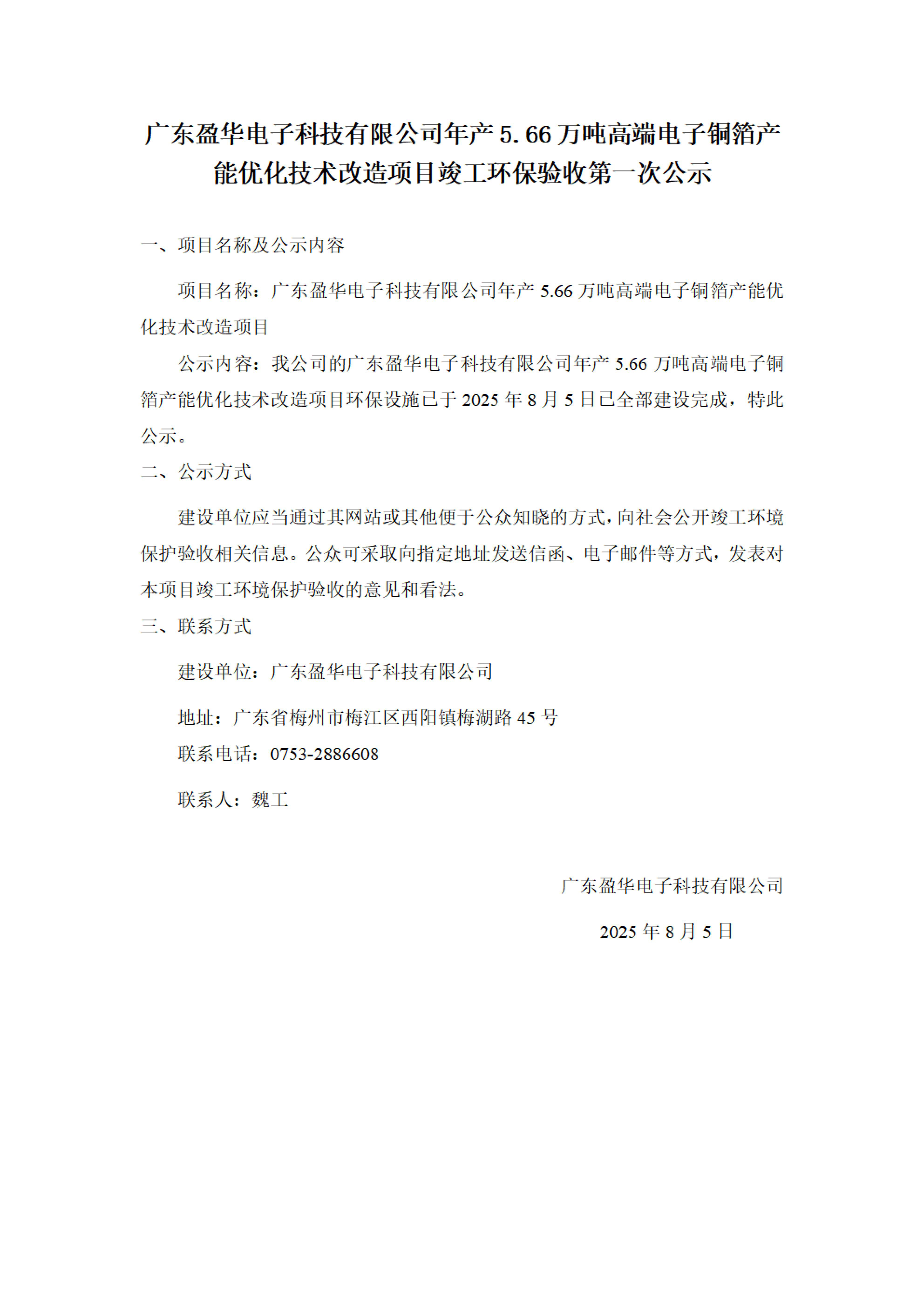 廣東盈華電子科技有限公司年產5.66萬噸高端電子銅箔產能優化技術改造項目竣工環保驗收第一次公示